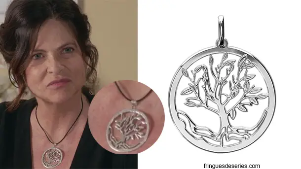 Le juge Laurence Moret (Charlotte Valandrey) convoque le père de Lola dans son bureau dans l’épisode 280 de Demain nous appartient. Elle porte un pendentif en argent 925/1000 qui représente l’arbre de vie. On le trouve ici