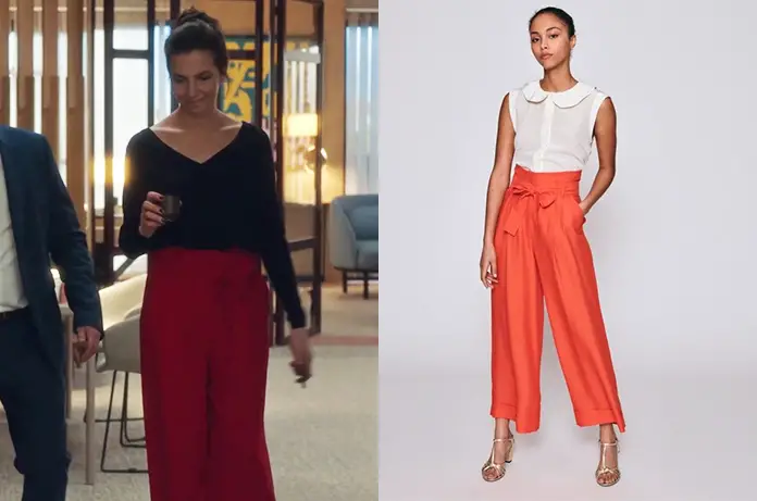 On voit parfois Sophie Novak (Carole Bianic) avec un élégant pantalon rouge. Large et ceinturé. C’est le cas dans l’épisode 1187, de Demain nous appartient bien sûr. S’il semble tomber différemment que la photo du mannequin, c’est parce que la cheffe costumière Wanda Wellard a rallongé l’ourlet du pantalon. Il s’agit d’un modèle Tara Jarmon