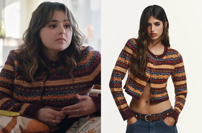 Dans Demain nous appartient épisode 2110, Maud (Sixtine Dutheil) porte un petit gilet jacquard que l’on trouve ici.