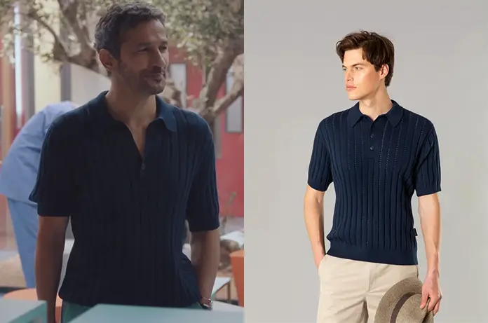 William (Kamel Belghazi) peut être cool à l’hôpital, comme lorsqu’il porte ce confortable polo bleu marine en maille dans Demain nous appartient 967.