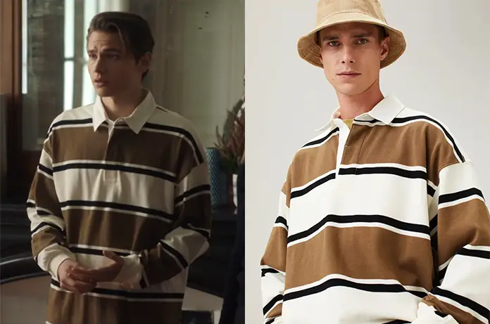 Adam (Alain Le Bars) porte ce polo style rugbyman avec de larges rayures marron dans Demain nous appartient 1360.