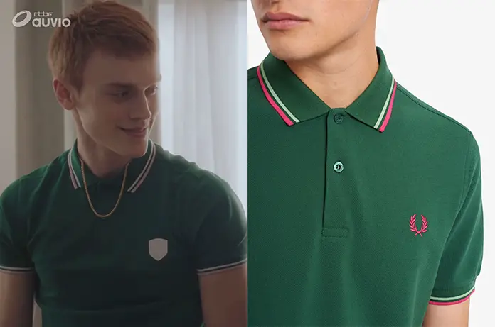 Gaspard (Mogamed Bechiev) portait un polo vert avec un bord contrastant rose dans Demain nous appartient 919. On le trouve ici