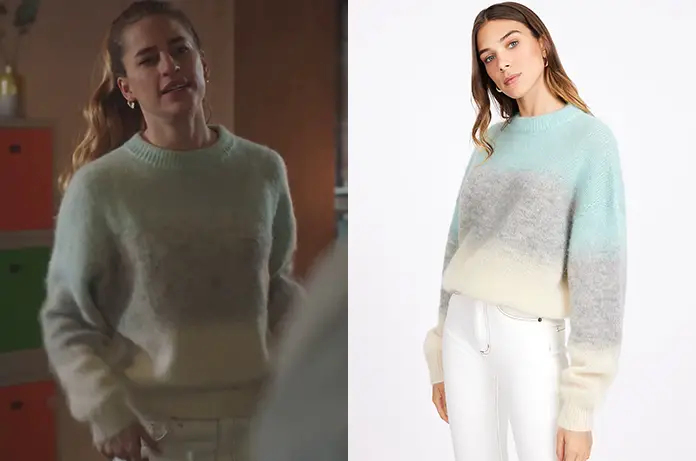 Victoire (Solène Hébert) portait ce joli pull en mohair avec des bandes de couleurs douces, dans Demain nous appartient 1124. On le trouve ici.