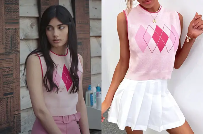 Camille (Elisa Ezzedine) portait un ravissant pull à losanges, sans manches, dans Demain nous appartient 938. On le trouve ici