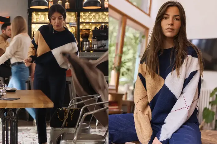 Dans l’épisode 2148 de Demain nous appartient, Soraya (Kenza Saïb Couton) porte un pull en maille qui revisite avec modernité le motif classique de l’argyle (losanges). Cette pièce apporte une touche de douceur et de structure à sa garde-robe d’avocate.