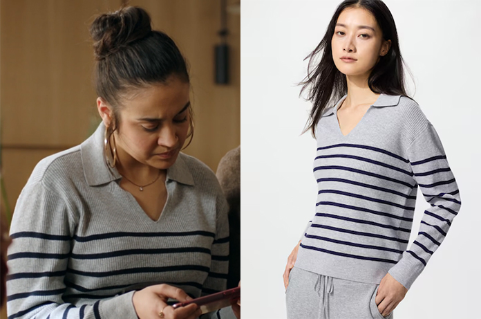Noor (Sahelle De Figueiredo) porte, dans Demain nous appartient épisode 2162, un pull en maille côtelée grise, orné de rayures horizontales bleu marine sur le buste et les manches. L’originalité vient de son col polo ouvert sans boutons, qui apporte une touche décontractée et féminine.