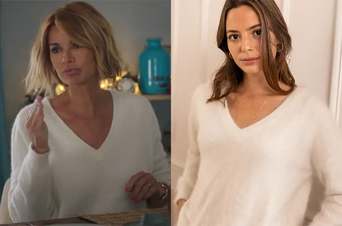 Chloé (Ingrid Chauvin) a mis son pull blanc en mohair dans Demain nous appartient 1329. Il s’agit du modèle Andrew de la marque Marie-Sixtine.