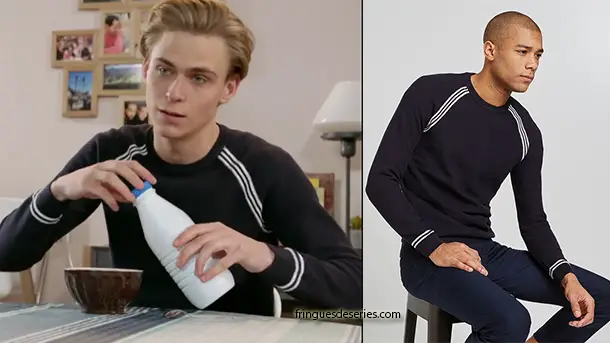 Bart Vallorta (Hector Langevin) prend son petit déj avec le capitaine Saïd dans l’épisode 178 de Demain nous appartient. Il porte son nouveau pull bleu marine qu’il a acquis chez Jules.