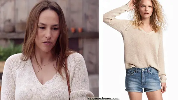 Le lendemain de sa randonné cauchemardesque, Rose (Vanessa Demouy) va mieux. Elle porte un pull en maille lâche de couleur claire. Il s’agit d’un modèle H&m qui existe ici en divers coloris. (Choisir le pays de destination tout en bas de page, au milieu. Les dispnibilités varient selon le pays)