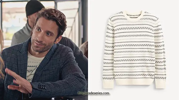 Rose (Vanessa Demouy) a invité un faux Marco (Nicolas Jacques) pour se venger d’Antoine, dans DNA 642. Il porte un pull blanc à motifs jacquard.