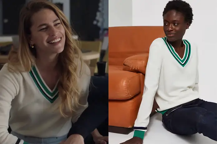 Dans Demain nous appartient 1168, Victoire (Solène Hébert) porte ce joli pull, col en V, avec une bordure verte.