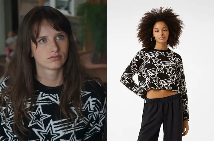 Emma (Luna Lou) porte un pull étoilé pour aller s’excuser chez Chloé dans Demain nous appartient 1329.