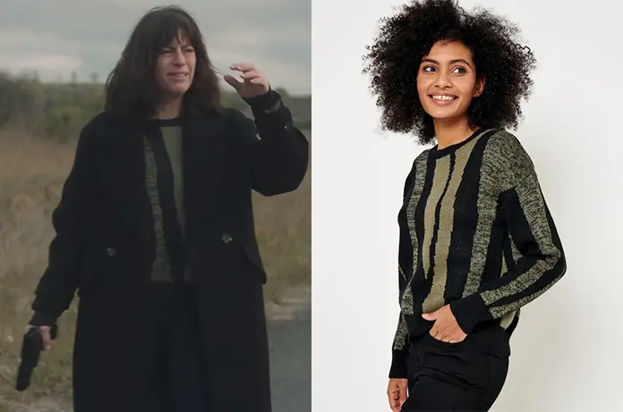 Flore (Anne Caillon) fera ses adieux à Demain nous appartient dans l’épisode 1121. Elle portera ce pull à imprimé graphique. On le trouve ici.
