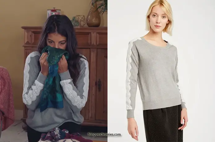 Image émouvante de Soraya (Kenza Saïb Couton) qui recherche le parfum de sa mère dans un foulard. Dans cet épisode de Demain nous appartient 777, la jeune femme porte un pull gris garni de dentelles sur les manches. On le trouve ici
