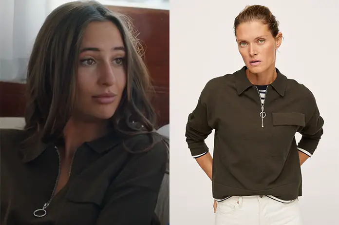 Elle prote un pull kaki zippé de la marque Mango.
