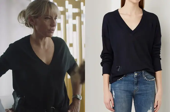 Aurore (Julie Debazac) continue son enquête sur le mystérieux corbeau, harceleur, agresseur. Elle porte dans Demain nous appartient 1084 un pull noir en cachemire, col en V, disponible ici et ici (Belgique)