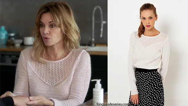 Dans l’épisode 387 de Demain nous appartient, vous avez sans doute remarqué le pull rose au plastron ajouré de Chloé (Ingrid Chauvin). La styliste Joséphine Gracia l’a choisi chez Camaïeu. Nous n’avons pas retrouvé exactement le même. Vous trouverez celui de l’illustration ici.