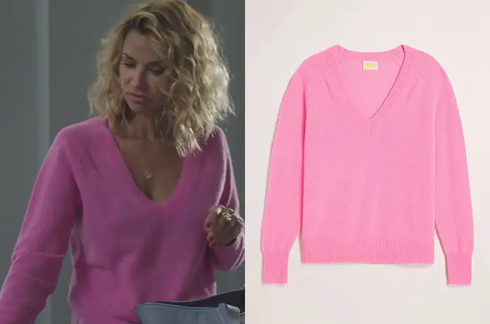Chloé (Ingrid Chauvin) portait un joli pull en cachemire rose, avec un grand V, dans Demain nous appartient 1042. On le trouve ici