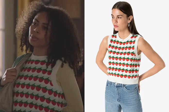 Angie (Louise Marion) porte un pull sans manches imprimé fraises dans Demain nous appartient 1120. On le trouve ici