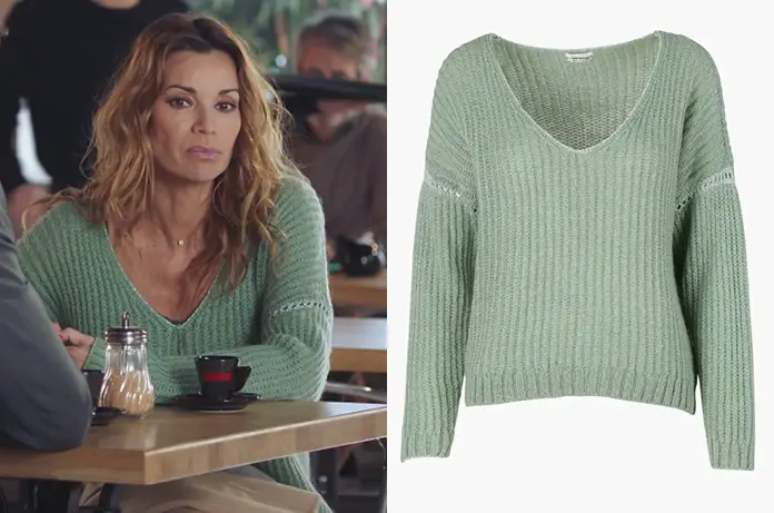 Chloé (Ingrid Chauvin) sous le choc dans DNA 878. Elle vient d’apprendre le retour de Marc Véry. Elle porte tout l’épisode un pull vert ample, avec un col en V. De la marque Ikks, il est en rupture de stock.
