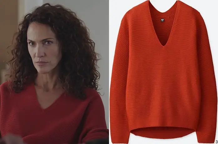 Clémentine (Linda Hardy) portait un pull rouge texturé, avec col en V dans Demain nous appartient 802. Il s’agit d’un modèle Uniqlo, dit 3D, indisponible.