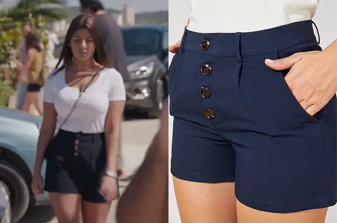 Chemsa (Sonia Eden) choisit un short bleu marine pour se promener dans Demain nous appartient. Outre la coupe, les 4 boutons apparents lui donnent une certaine originalité. Ce modèle peut se retrouver ici