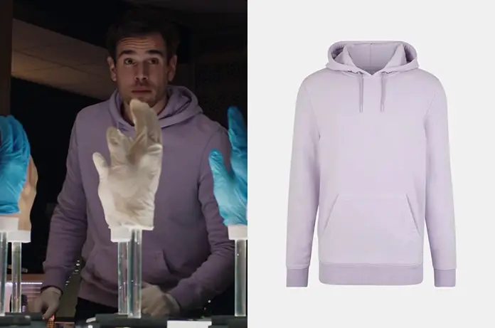 Damien (Adrien Rob) porte un sweat à capuche lilas pour analyser les gants retrouvés dans les poubelles de l’hôpital, dans Demain nous appartient 1145. On le trouve ici.