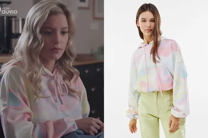 Solenne (Artemisia Toussaint) portait un sweat à capuche tie and dye pastel dans Demain nous appartient 919. On le trouve ici.