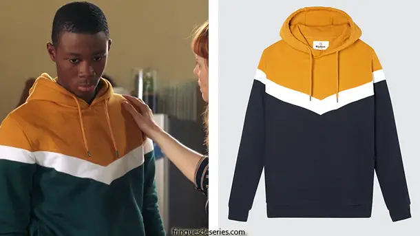 Souleymane (Dembo Camilo) revient de sa fugue dans l’épisode 576 de Demain nous appartient. Il a gardé son sweat color-block. On le trouve ici dans diverses couleurs.