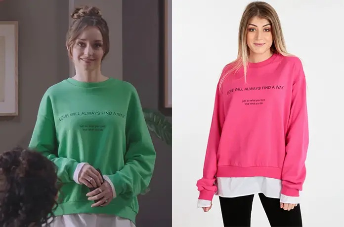 Sofia (Emma Smet) porte un sweat vert « love will always find a way » dans Demain nous appartient 916. On en trouve avec d’autres coloris ici