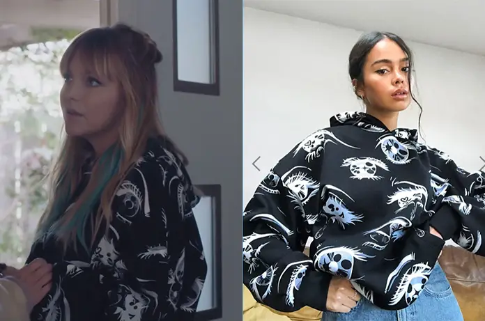 Dans Demain nous appartient, Judith (Alice Varela) a encore un nouveau sweat, noir, avec des yeux en imprimé. Il s’agit d’un modèle de la collection Billie Eilish chez Bershka.