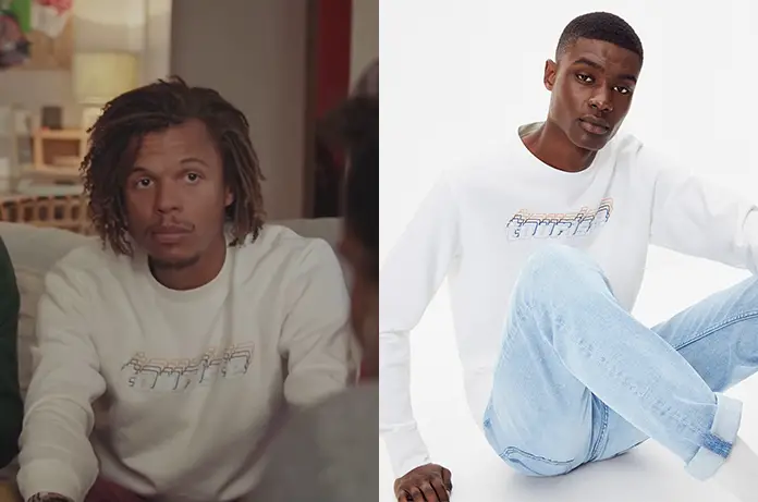 Ulysse (Sébastien Capgras) prend l’apéro, dans Demain nous appartient 799, chez Clémentine avec un sweat blanc portant l’inscription « touriste ». On le trouvait ici