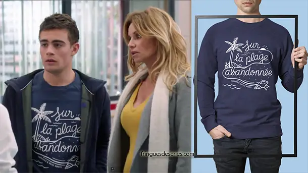 Maxime (Clément Remiens) s’inquiète pour la santé de son père. Il porte un sweatshirt ‘Sur la plage abandonnée’ Step Art dans l’épisode 189 de Demain nous appartient
