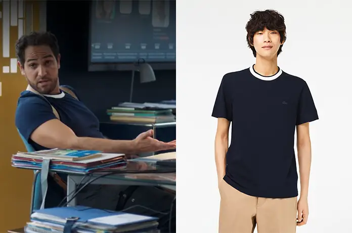 Karim (Samy Gharbi) continue son enquête, dans Demain nous appartient 1485, avec un t-shirt bleu marine, avec le col bordé de blanc.