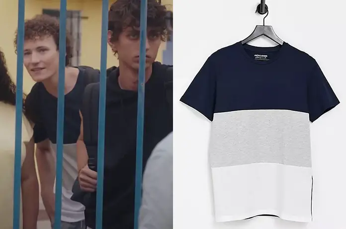Jack (Dimitri Fouque) portait un t-shirt colorblock pour son arrivée à Sète dans Demain nous appartient 993. On le trouve ici