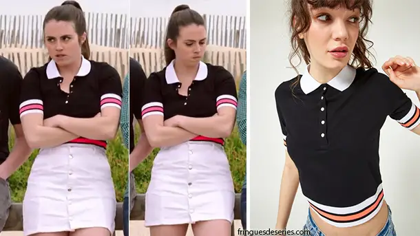 Charlie (Clémence Lassalas) n’est pas de très bonne humeur dans l’épisode 482 de Demain nous appartient. Elle porte un petit t-shirt esprit polo noir, blanc rose fluo que l’on trouve ici