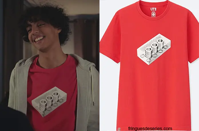 Nouveau personnage qui débarque à Sète dans Demain nous appartient 849. Il s’agit d‘Isam (Anouar Kardellas) qui viendra s’installer chez Karim et Anna. Il porte un t-shirt rouge avec un lego. On le trouvait chez Uniqlo.