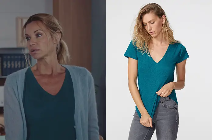 Chloé (Ingrid Chauvin) porte un t-shirt vert émeraude dans Dna 799. Il est disponible ici