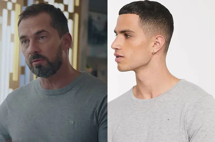 Martin (Franck Monsigny) dévoile un élément important pour faire avancer l’enquête sur l’agression de Charlie à la fin de l’épisode 801 de Demain nous appartient. Il porte un t-shirt longues manches gris que l’on trouve ici.