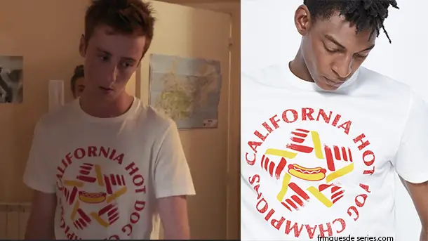 Le t-shirt hot dog de Dylan Moreno (Joaquim Fossi) est disponible ici. Il le portait dans l’épisode 249 de Demain nous appartient.