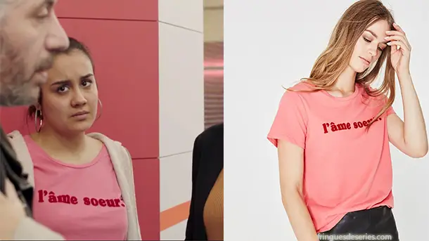 Noor Beddiar (Sahelle De Figueiredo) croise son père à l’hôpital dans l’épisode 426 de Demain nous appartient. Elle porte un t-shirt rose avec la mention « l’âme sœur. » On le trouvait chez Promod.