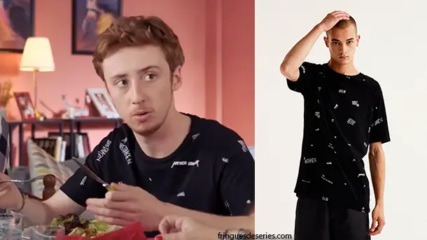 Dylan Moreno (Joaquim Fossi) dine en famille avec son t-shirt noir avec des inscriptions telles I’m mistaken dans l’épisode 469 de Demain nous appartient. On le trouvait chez Pull and Bear.