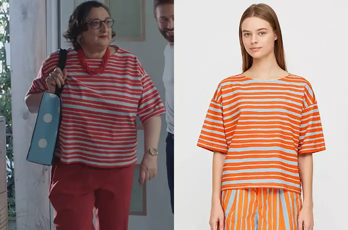 Nouveau look pour Mona (Catherine Benguigui) dans Demain nous appartient 948. Pantalon rouge et t-shirt ample à rayures rouges et turquoise. Il s’agit d’une collaboration de la styliste finnoise Marimekko avec Uniqlo.