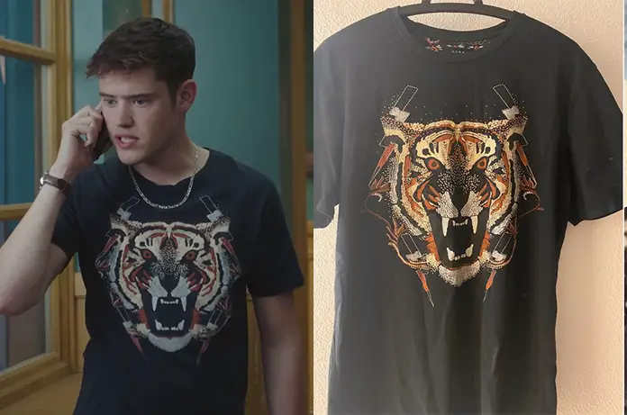Jules (Xavier Widhoff) s’apprête à partir pour Lyon dans Demain nous appartient 936. Il portera son t-shirt tête de tigre. Un modèle Zara que l’on trouve encore en 2e main comme ici.