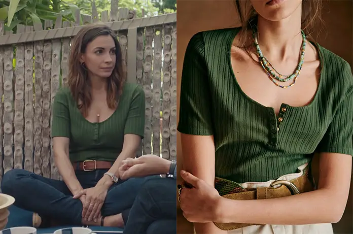 Louise (Alexandra Naoum) portait ce t-shirt vert avec une encolure boutonnée de 4 pressions dans Demain nous appartient 1007. Va-t-elle accepter le défi qui se présente à elle ?