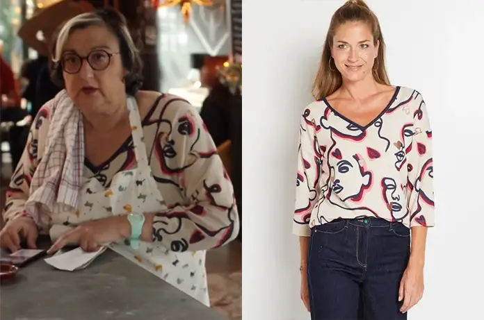 Mona (Catherine Benguigui) porte un t-shirt avec un imprimé visages pour bosser au Spoon dans Demain nous appartient 1333.
