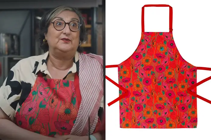 Mona (Catherine Benguigui) se met à la cuisine dans Demain nous appartient 1265. Elle porte, pour l’occasion, un joli tablier avec des coquelicots.