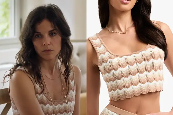 Roxane (Raphaële Volkoff) a des doutes sur la santé mentale de Violette dans Demain nous appartient épisode 1476. Elle porte un petit top à chevrons que l’on trouve ici