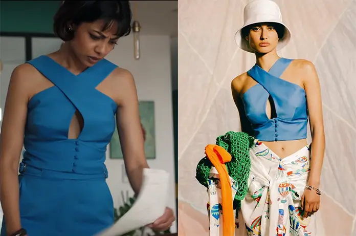 Lou (Rani Bheemuck) porte, dans Demain nous appartient épisode 1991, ce haut bleu sans manches qui révèle un design croisé audacieux à l’avant, avec une découpe goutte d’eau au creux de la poitrine. Les boutons recouverts du même tissu stylisent l’ensemble.