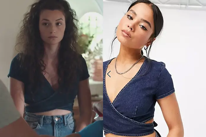 Manon passe une journée plutôt mouvementée, dans Demain nous appartient 973, vêtue d’un joli top indigo en denim. On le trouve ici